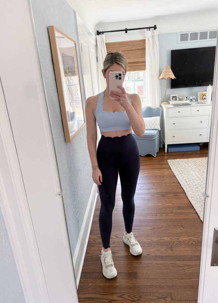 I had to get the scallop sports bra and matching leggings! They are so cute on!! And are really comfy and supportive. I was a little nervous when I pulled the leggings out of the package because the butt area has a little scrunch to them. I have never seen anything like that before, but they make your butt look really good!! They are so comfy and fit snuggly without feeling too snug. I took my true size small in the leggings. And for the sports bra, I sized up to a medium which I always do in sports bras. I don’t like them overly tight. I did my TSS workout in this outfit and felt great!