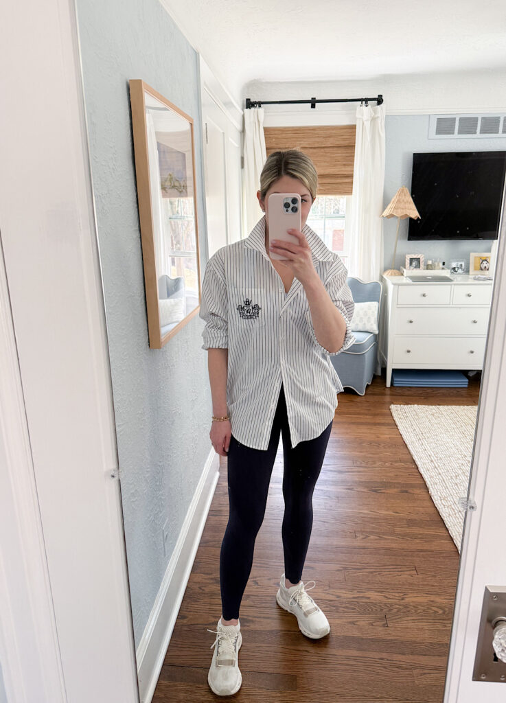 I’m a huge fan of button downs especially a classic blue and white stripe. This one has such a good fit to it too! And the collar stays up lol. I love it paired with leggings for a more dressed up but still casual outfit. This is perfect for when you want the comfort of leggings but still want to feel a little more dressed up or put together. Or a great option to throw over your workout look when you are headed to or from the gym. I took my usual size small in the top.