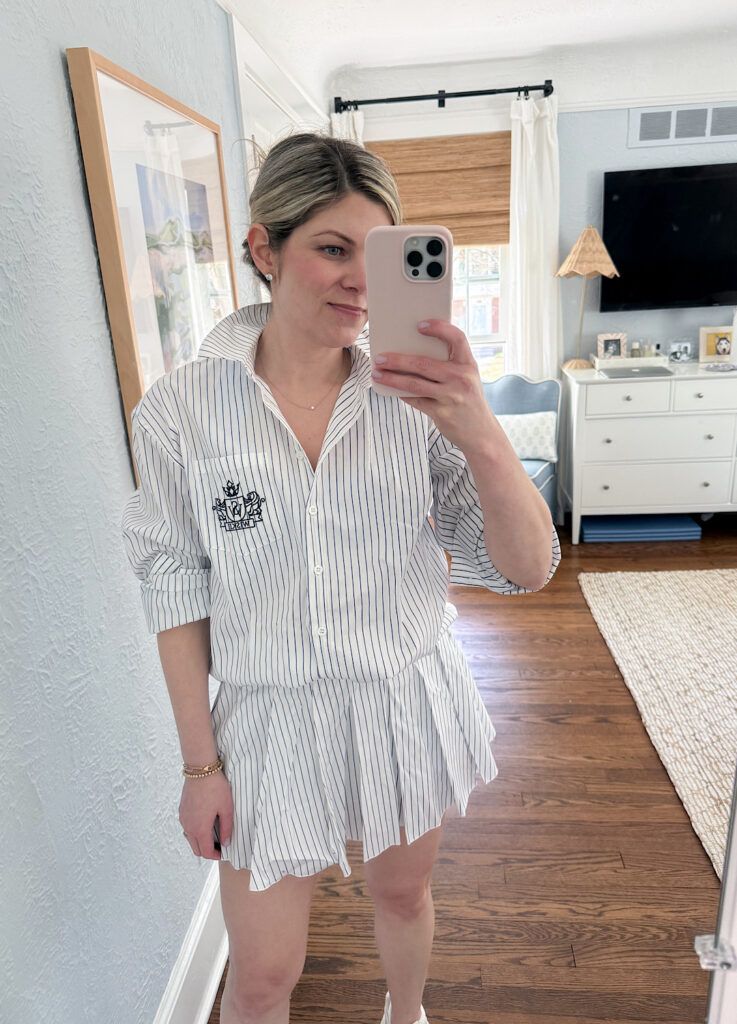 I am most excited to wear this pleated skirt with the matching button down once the weather warms up (don’t look at my pale legs lol)!!! The skirt has built in shorts underneath and a side zipper so you don’t have to worry about anything. I sized up to a medium in the skirt and I am glad that I did. But lately, I have been all about a roomier fit in my clothing.